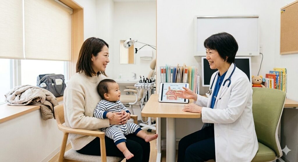 「鼻水がなくならないと中耳炎は治らないので、お家でもこまめに鼻水を吸ってください」